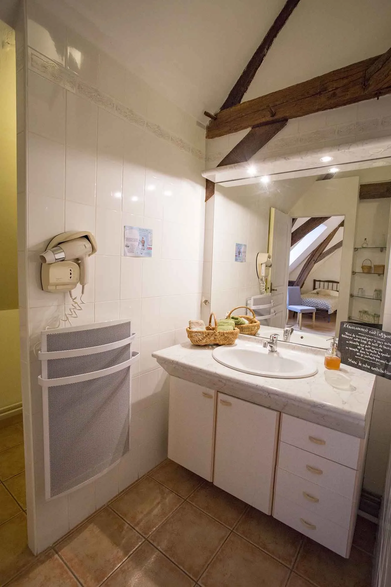 La salle de pain privative de cette chambre est composé d’une grande douche, un lavabo, et un toilette. Tout le nécessaire de toilette est mis à votre disposition comme les serviettes de toilettes, serviettes de bain et essuie mains.